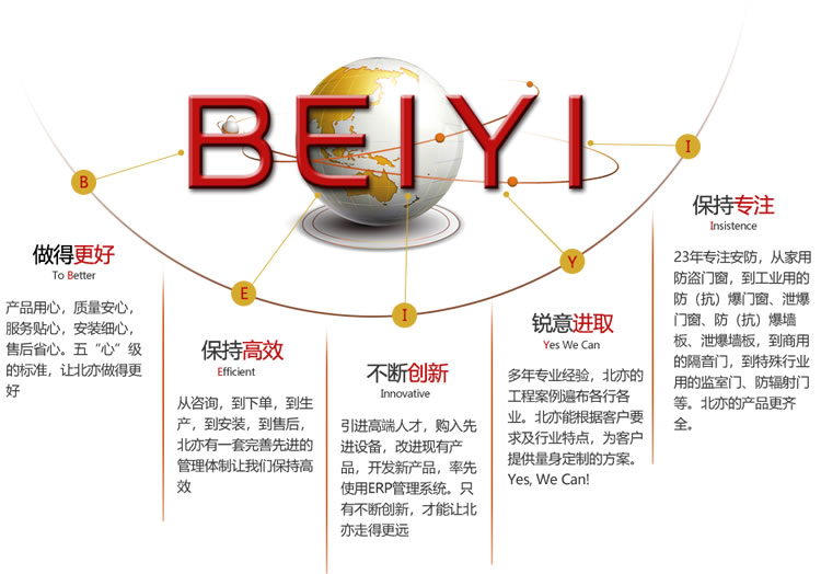 北京群升北亦門業(yè)有限公司(簡(jiǎn)稱“北亦門業(yè)”)始建于1996年,是一家生產(chǎn)制造多元化的名牌企業(yè)。公司注冊(cè)資金6000萬,固定資產(chǎn)2000萬元,占地面積8465平方米。公司技術(shù)力量雄厚,可生產(chǎn)各式高中低檔防盜門、抗爆門窗、泄爆門窗、防彈門窗、防輻射門、監(jiān)室門、廠房門、飛機(jī)庫(kù)門、樓宇門、別墅門、防火門、隔音門等系列產(chǎn)品。公司所有產(chǎn)品均有國(guó)家主管部門出具的權(quán)威檢測(cè)報(bào)告。